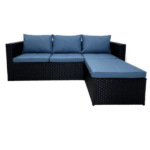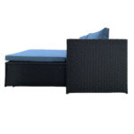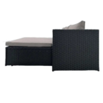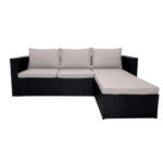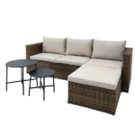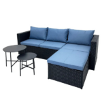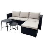 El sofá incluye cojines acolchados y removibles, lo cual facilita su limpieza y mantenimiento. Además, la tela repelente a líquidos protege los cojines de manchas y salpicaduras, convirtiéndolo en una opción práctica para espacios al aire libre. Igualmente, el set incluye dos mesitas auxiliares negras con diseño moderno que complementan perfectamente el conjunto.