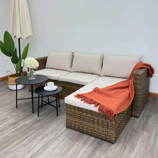 El Sofá Seccional en L Tokoa de Ratán Sintético es, sin duda, la opción perfecta para transformar tu terraza, balcón o jardín en un espacio moderno y acogedor. Además, gracias a su diseño elegante en ratán sintético café claro y cojines en tela lino beige, podrás disfrutar de momentos de descanso con estilo y comodidad. Por otro lado, sus materiales resistentes garantizan que el sofá se mantenga en excelente estado durante mucho tiempo.