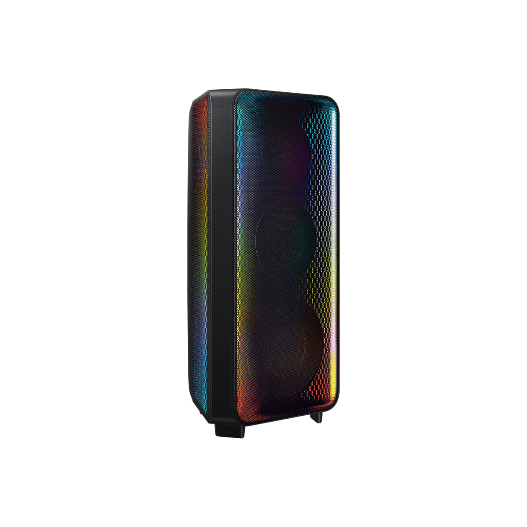 Además, la Torre de Sonido Samsung ST90 ofrece una variedad de modos de luces divertidas, incluyendo Fiesta, Ambiente y Danza, que puedes ajustar fácilmente a través de la aplicación de la Sound Tower. Esta aplicación también te permite controlar efectos de sonido y ecualizadores, lo que te convierte en el DJ de tu propia fiesta.