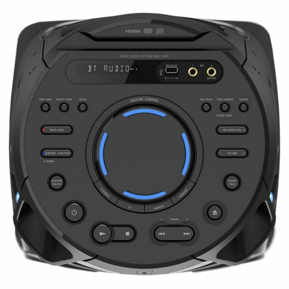 También con su conectividad Bluetooth, olvídate de cables molestos. Solo empareja tu dispositivo y deja que la música fluya. Además, la MHC-V43D no es solo un parlante, ¡es toda una experiencia visual! Con luces integradas que se sincronizan con el ritmo de la música, crearás el ambiente perfecto para tus eventos. Así que no te preocupes por la duración, ya que su batería de larga duración asegura que la fiesta no se detenga.