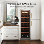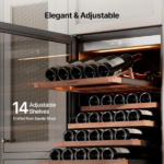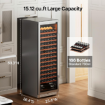 La vinera Ca’Lefort de 166 botellas 24 pulgadas es ideal para los amantes del vino. Además, con dimensiones de 26,4″ de profundidad, 23,4″ de ancho y 69,3″ de alto, ofrece una capacidad de 15,12 pies cúbicos. Por lo tanto, puede almacenar hasta 166 botellas, mientras que el panel digital permite ajustar la temperatura con precisión. Asimismo, los estantes de madera y la luz LED ajustable mejoran la organización y el ambiente.