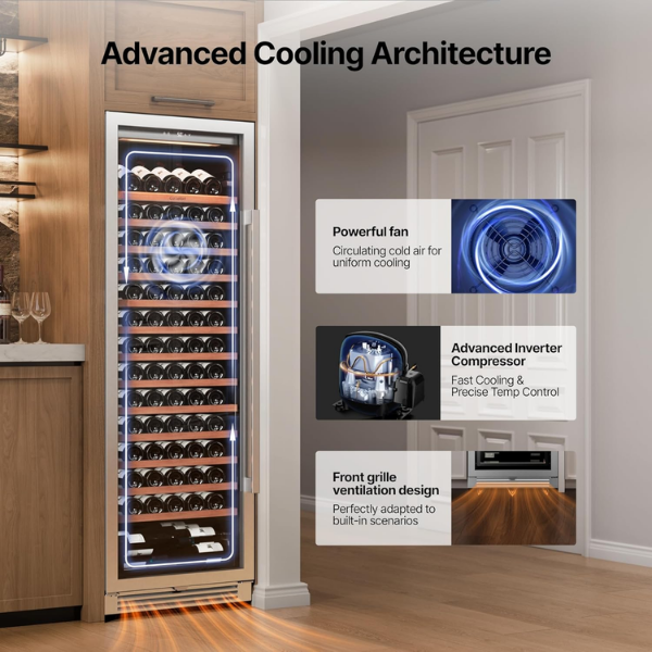 El sistema de refrigeración es eficiente y confiable. De hecho, el compresor inversor y la circulación de aire interno aseguran un enfriamiento uniforme. Además, la función de memoria mantiene la temperatura tras un corte de energía. Así, los vinos se conservan siempre en condiciones estables.