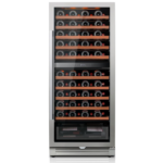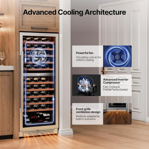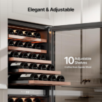 La vinera Ca’Lefort doble zona de 24 pulgadas es ideal para los amantes del vino. Además, ofrece espacio para hasta 90 botellas, lo que permite conservar vinos tintos y blancos a su temperatura correcta. Para mayor precisión, el panel digital facilita el ajuste exacto, mientras que los estantes de madera se adaptan a distintos tamaños.