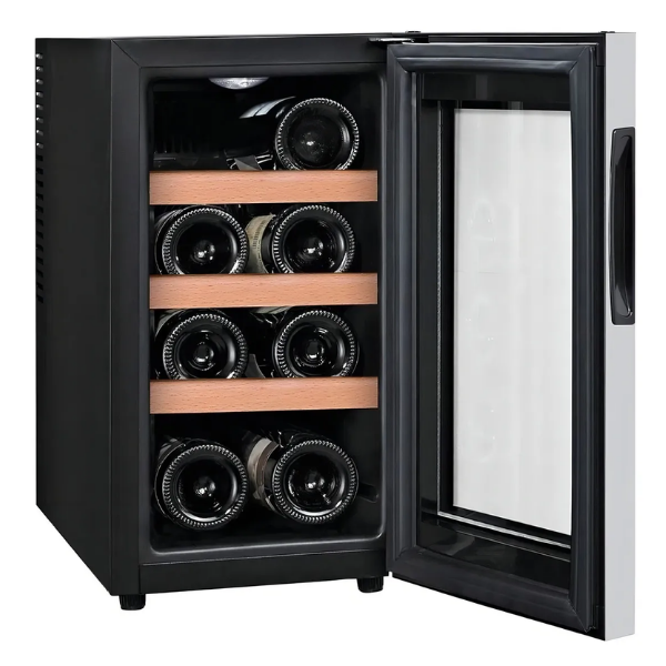 El sistema de refrigeración termoeléctrico mantiene los vinos frescos sin generar ruido ni vibraciones, por lo que cuida el aroma y sabor de cada botella. La cava es vertical y compacta, con dimensiones de 25.4 cm x 45 cm x 51 cm, lo que significa que se puede colocar en cocinas, salas o bares pequeños. Asimismo, su voltaje de 127V y frecuencia de 60 Hz garantizan un uso seguro en el hogar.