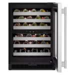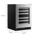 La vinera 24 KUWR324SSB de KitchenAid ofrece diseño elegante y función práctica; además, se integra fácilmente bajo la encimera. Su gabinete negro con puertas de acero inoxidable crea un estilo moderno; por ello, combina con distintos espacios. Asimismo, su tamaño compacto permite una instalación sencilla.