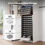 La vinera Yeego de 165 botellas es una excelente opción si deseas almacenar tu colección de manera organizada y segura. Además, cuenta con 14 estantes de madera de haya ajustables, por lo que puedes acomodar hasta 165 botellas, incluyendo botellas grandes como champán. Por otro lado, el borde de acero inoxidable no solo ofrece durabilidad, sino que también aporta estilo. De hecho, un divisor personalizado te permite separar vinos y accesorios fácilmente, facilitando la organización.