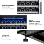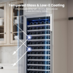 Gracias a su control digital de temperatura, puedes mantener tus vinos entre 40 y 65 °F de forma precisa. Asimismo, los ventiladores dobles distribuyen el aire frío de manera uniforme, garantizando que cada botella se conserve en condiciones óptimas. Además, la iluminación suave azul y blanca resalta tu colección y crea un ambiente elegante y acogedor.