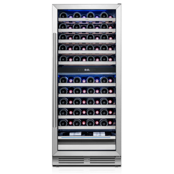 Vinera Yeego 24» con doble zona de 89 botellas, enfriamiento uniforme, estantes ajustables y puerta de vidrio Low-E. Conserva vinos tintos, blancos y espumosos a su temperatura ideal. Ideal para coleccionistas y uso empotrado o independiente.