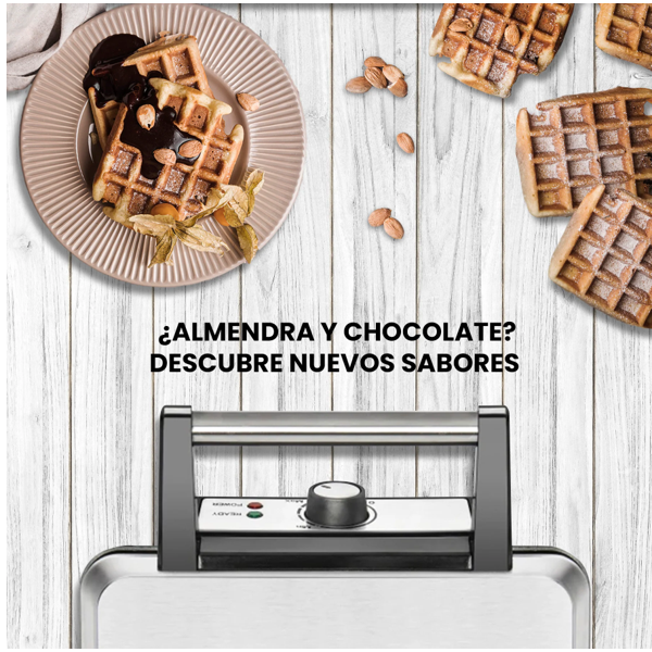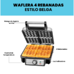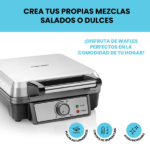 Una gran ventaja de esta waflera es que puedes hacer hasta cuatro waffles al mismo tiempo. Así, puedes preparar varios waffles de una vez y disfrutar de un desayuno rápido. También tiene un control de temperatura que te deja elegir si quieres los waffles más dorados o más suaves, según lo que más te guste.