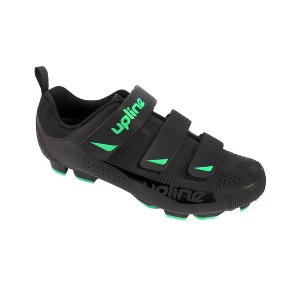Estos zapatos Upline son ideales para andar en bicicleta. Están hechos para ser muy cómodos y durar. Su color negro y verde es muy atractivo.